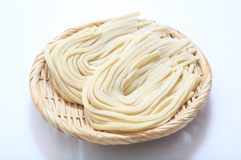 Udon (饂飩) is the thickest of Japanese noodles. White in color and made from wheat, they can be served either hot or chilled with dipping sauces, in broth, or in an array of other hot dishes. Udon is usually topped with various ingredients like mixed tempura fritters (kakiage), deep fried tofu pockets (aburaage), tempura, or prawn. Some examples of udon dishes include curry udon, kitsune udon, and yakii udon. A thin slice of fish cake (kamaboko) usually completes the dish.
